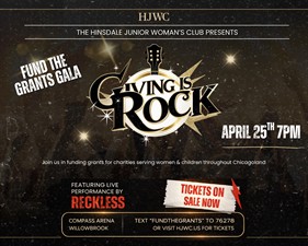 An evening where glamour meets impact! The Hinsdale Junior Woman’s Club proudly presents the Fund the Grants Gala "Giving is Rock" benefiting charities serving women & children throughout Chicagoland. Featuring live performance by Reckless, open bar, dinner, live auction, silent auction, raffle and more! Open to the public.